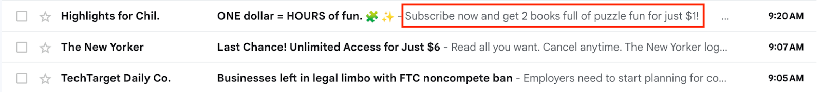 Design your email so that this area’s visual and textual content is eye-catching and makes opening your email irresistible. Here’s a look at a preview window in Gmail: